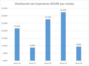 En cuanto al tipo de trabajos desempeñados, encontramos que la mayoría de Inspectores del SOIVRE realizan sus funciones en puestos de elevada responsabilidad, ocupyo niveles 27, 28 y 29 fundamentalmente, así como también un importante número de compañeros ocupan puestos en niveles 26, como refleja el gráfico siguiente:
