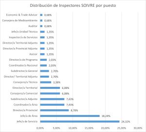 Este gráfico se complementa con el siguiente, que refleja la distribución de puestos que los Inspectores del SOIVRE ocupan en sus diferentes destinos, en el que la figura principal es la de jefe de servicio, pero que es complementada por Inspectores que desempeñan funciones muy diversas en gabinetes, como asesores en unidades técnicas, inspección de servicios, y por supuestos como Consejeros Comerciales en la red de 13 Ofecomes a las que el cuerpo tiene acceso.